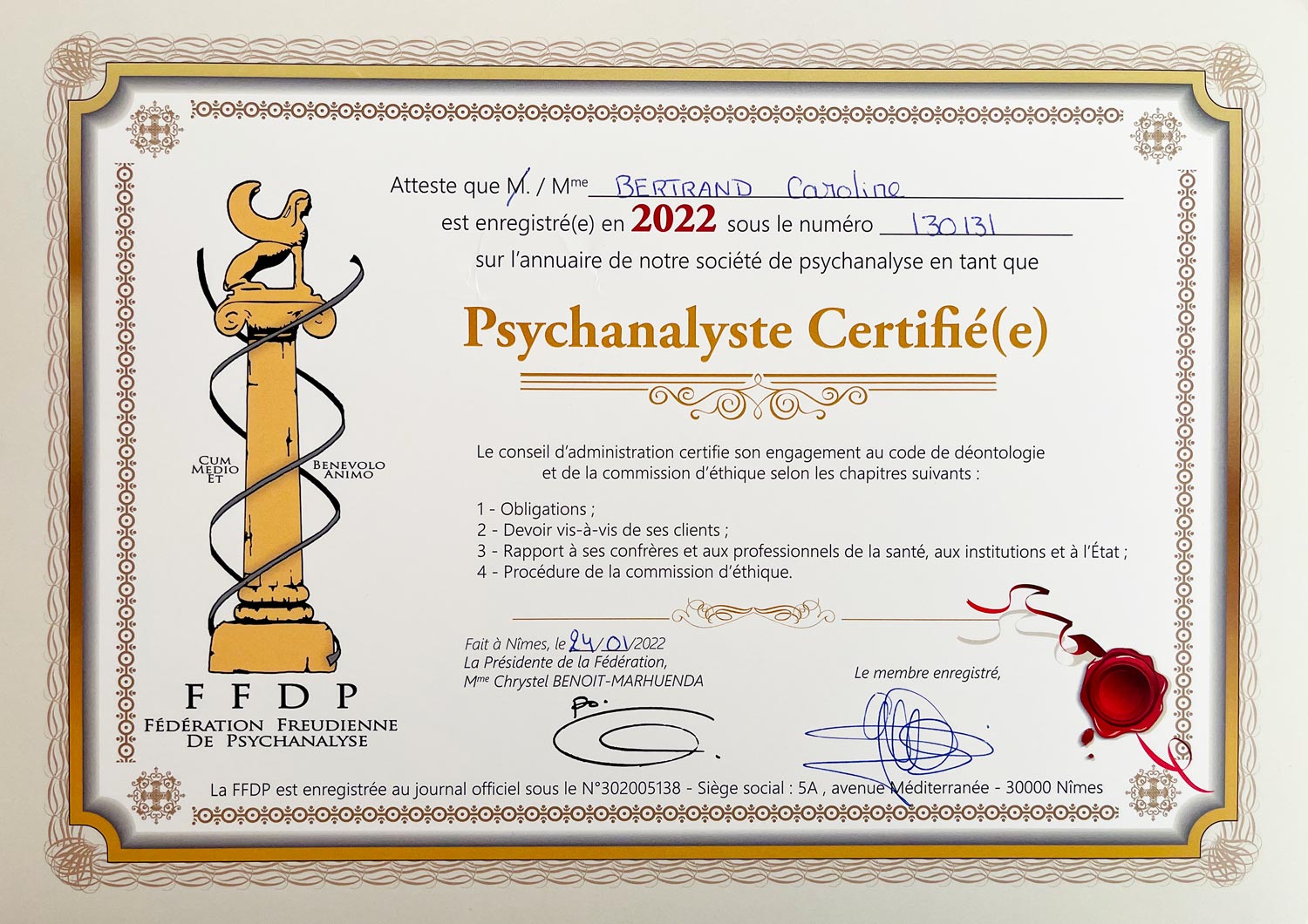 Caroline Bertrand, psychanalyste Freudienne, dispose d’une certification FFDP (Fédération Freudienne De Psychanalyse), qui répond à un code déontologique stricte et rigoureux.